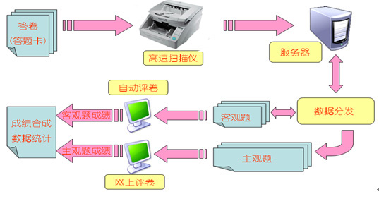 答題卡回收后進行掃描和識別,識別時客觀題識別與主觀題切割一次完成,閱卷系統自動對客觀題部分識別評分,主觀題的電子圖像文件自動存儲。