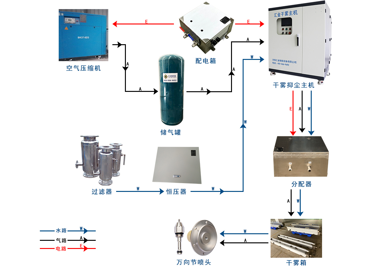 通過水轉(zhuǎn)接裝置/水箱/滑線等,向堆料機(jī)進(jìn)行水/氣輸送,使干霧在堆料機(jī)進(jìn)、出料端形成霧幕,達(dá)到對(duì)1-100μm粉塵的有效抑制。